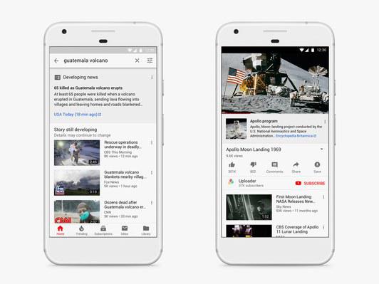 同时,在突发新闻发生时,新闻视频会直接出现在主页上,目前全球17个国家可使用该功能。主页上这部分内容只会呈现出YouTube认为来源权威的视频。之后推荐用户观看的视频也是同样如此。